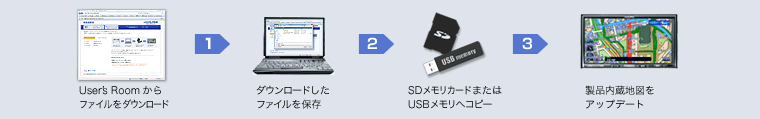 高速道地図データファイルをお客様のPCにダウンロードします。ダウンロードしたファイルをお手持ちのSDメモリーカードまたはUSBメモリにコピーします。SDメモリーカードまたはUSBメモリを製品に接続し、更新作業を行うことで、製品に内蔵されている地図データベースが最新のものに更新されます。