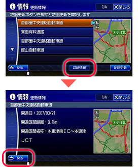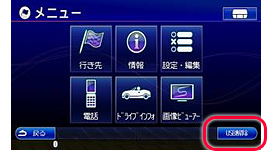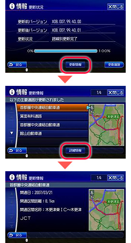 更新中に更新状況を確認したい時は、「メニュー」ボタンを押して 「情報」 にタッチしたあと 「その他」 の 「地図差分更新」 をタッチし、地図差分更新画面を表示させ 「更新状況」 にタッチしてください。