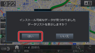 ※「データリストを表示しますか?」 が表示されない場合は、よくあるご質問 の 「WebからダウンロードしたデータをSDカードやUSBメモリーでナビに読み込ませようとしても、うまくいきません。」 の内容をご確認ください。