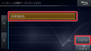 その場合は、SDカードまたはUSBメモリーをナビから取り出し、再度挿入してください。ナビ上にインストール可能データリストが表示されるので、「高速道配信」をタッチ後「インストール」をタッチします。