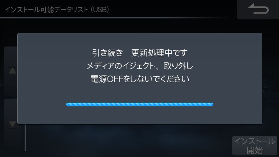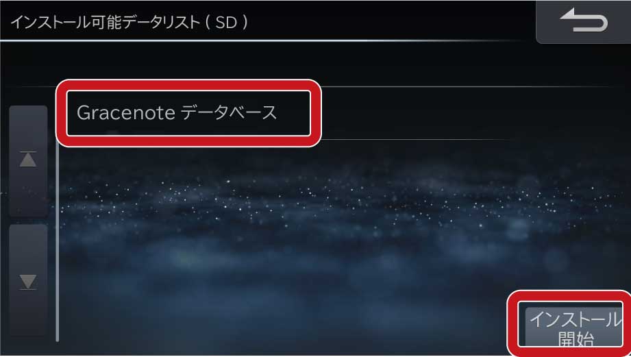 その場合は、SDカードまたはUSBメモリーをナビから取り出し、再度挿入してください。ナビ上にインストール可能データリストが表示されるので、「Gracenoteデータベース」をタッチ後「インストール開始」をタッチします。